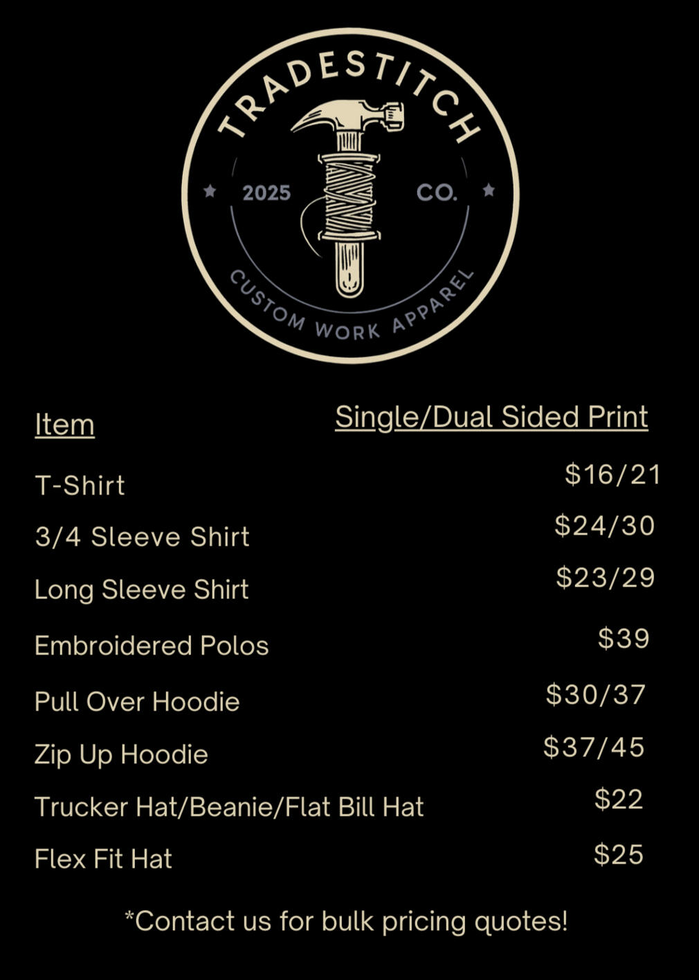 Here at TradeStitch Co., our family is dedicated to printing bold, durable branding on the gear hardworking crews rely on. Our mission is to deliver tough, reliable custom prints that reflect the pride, grit, and identity of the teams who wear them. Family-owned. Quality-driven. Built to stand out on the job.